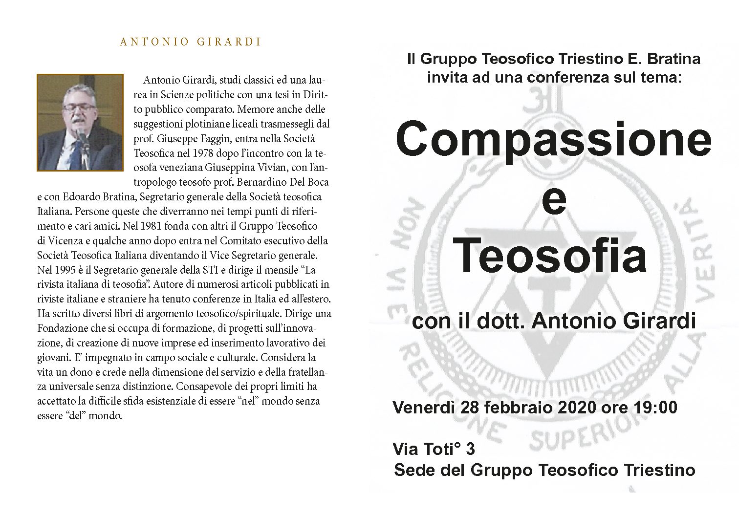 Compassione e Teosofia con antonio Girardi Segretario Nazionale S.T.I. Calendario Quando: 28/02/2020@19:00–20:00 2020-02-28T19:00:00+01:00 2020-02-28T20:00:00+01:00